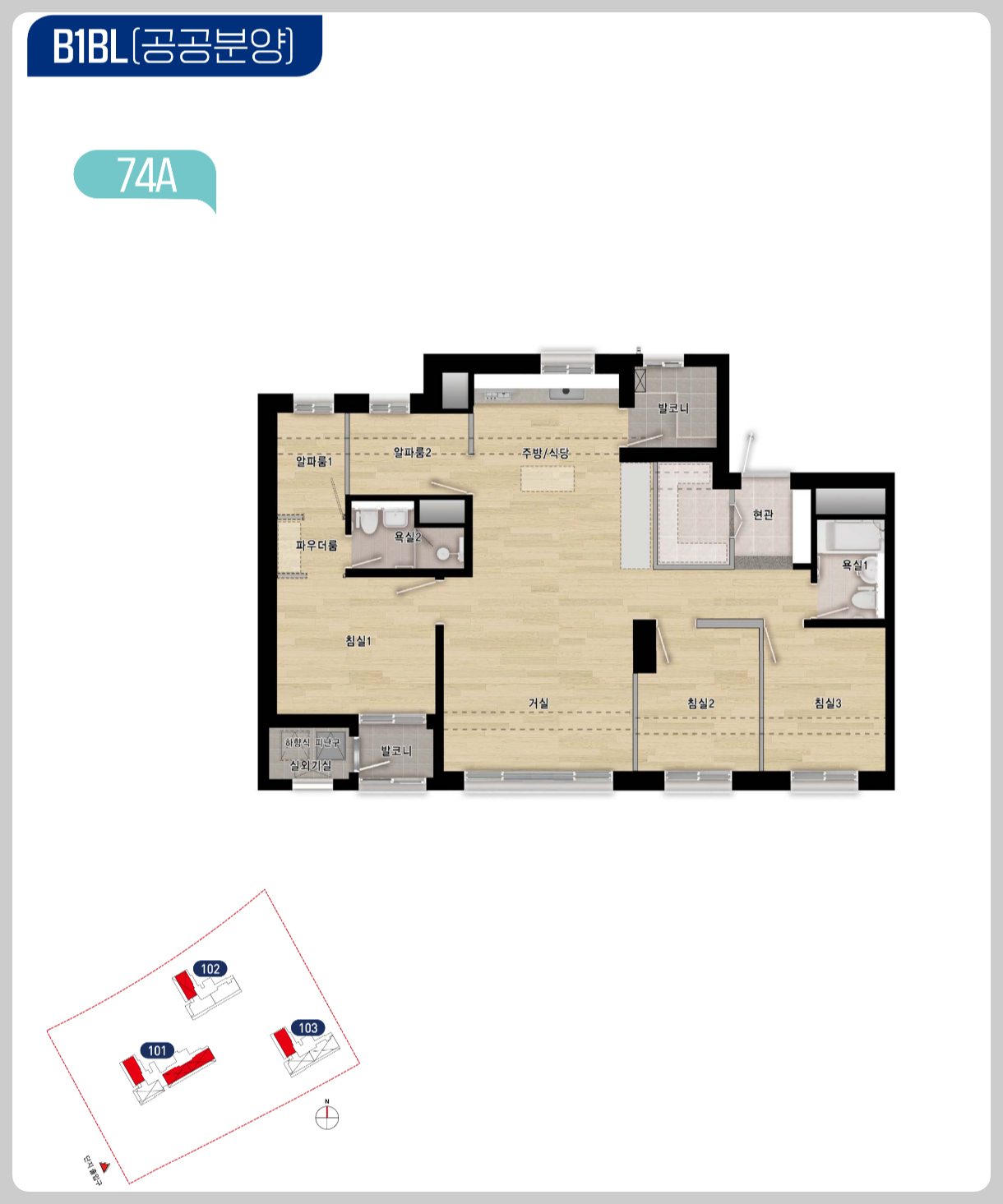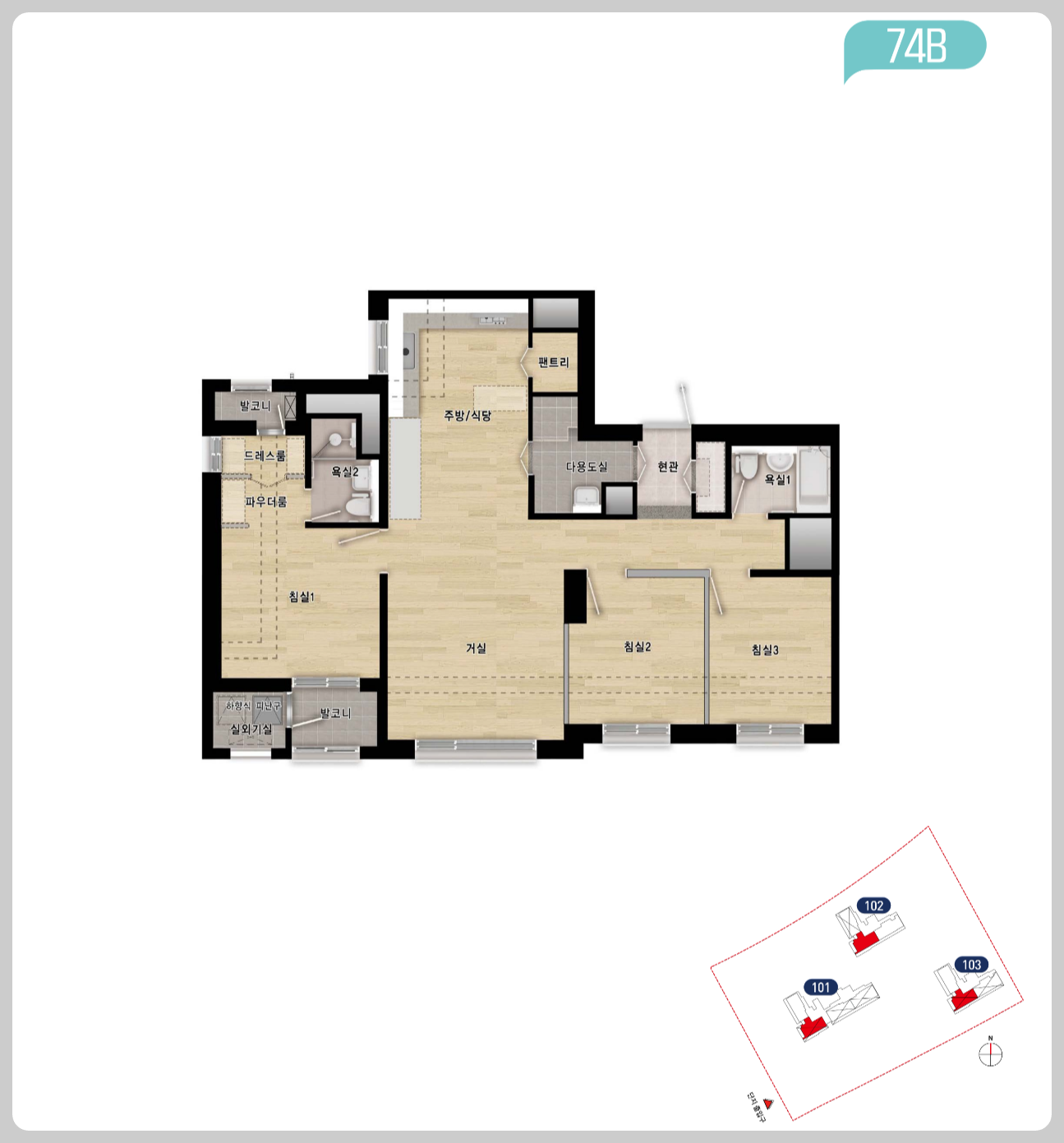 74타입 구조 잘빠졌습니다. 알파룸까지 방 4개