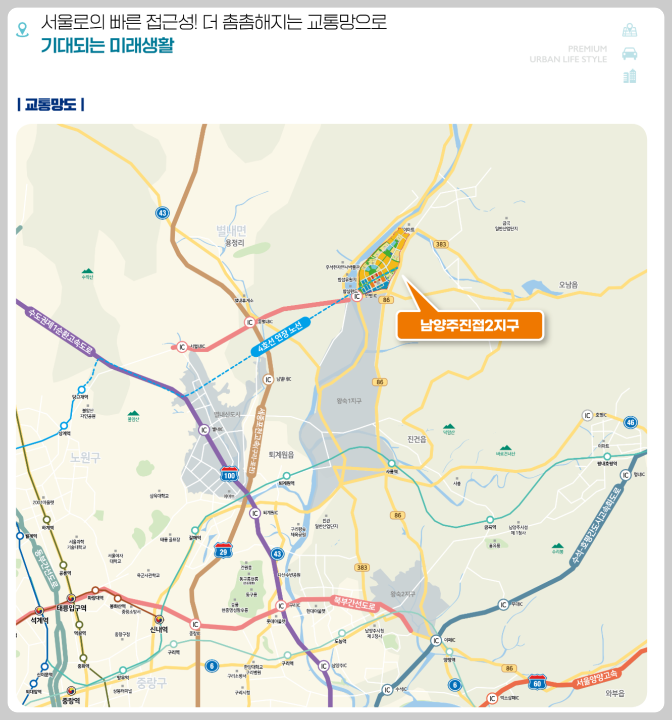 풍양역 바로 옆에 들어섭니다. 남양주~하남간 고속도로와 남양주~파주운정간 고속도로 추가건설 예정입니다. 사통팔달 남양주 진접2지구.